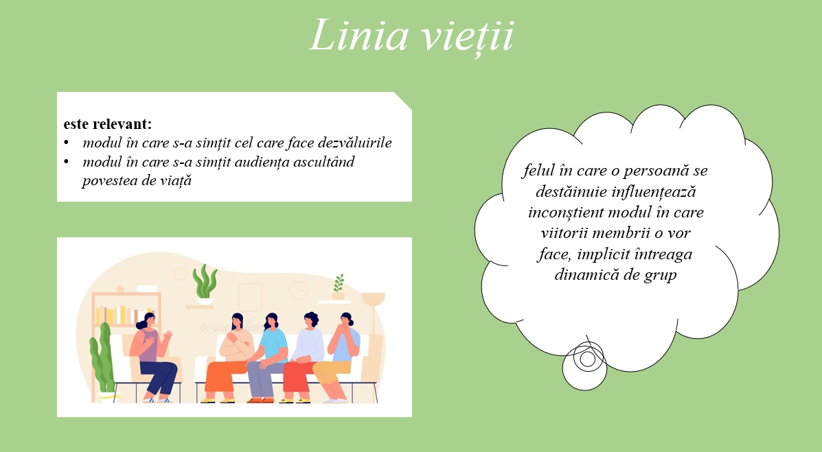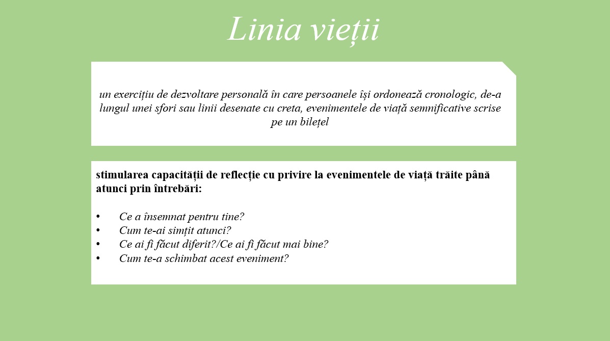 Linia vieții este un exercițiu de dezvoltare personală care îi poate ajuta pe adolescenți să își îmbunătățească capacitatea de reflecție asupra situațiilor de viață atât din propria experiență, cât și din cea a celorlalți membrii ai grupului, fiind în ipostaza de a se dezvălui publicului, respectiv, în cea de a audia.